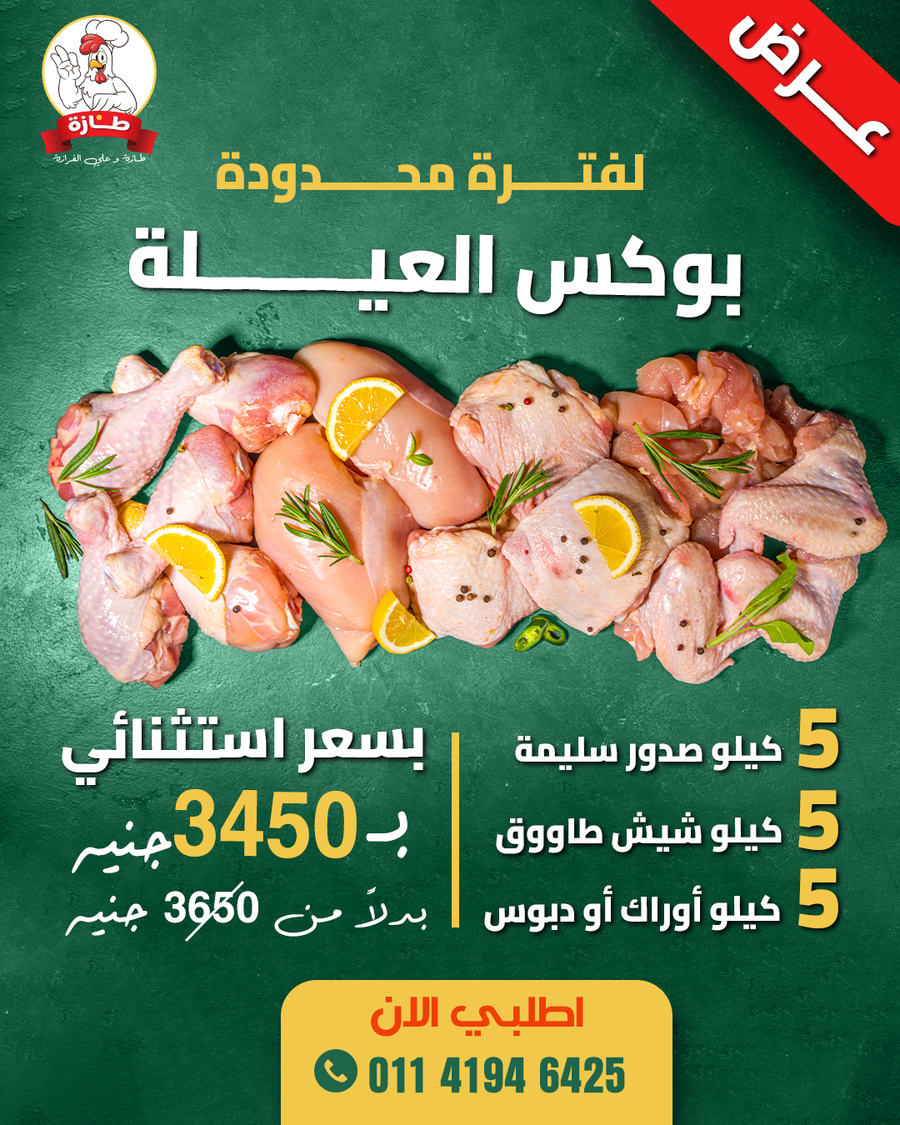 بوكس مجزءات العيلة يشمل عدة مجزءات فراخ أبيض تربية بيتي بدون هرمونات وسن صغير بتستوي بسرعة ولحم طري فريش مغسولة بدقيق وملح وليمون خالية من الريش والزفارة