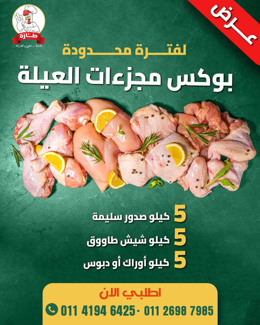 بوكس مجزءات العيلة يشمل عدة مجزءات فراخ أبيض تربية بيتي بدون هرمونات وسن صغير بتستوي بسرعة ولحم طري فريش مغسولة بدقيق وملح وليمون خالية من الريش والزفارة