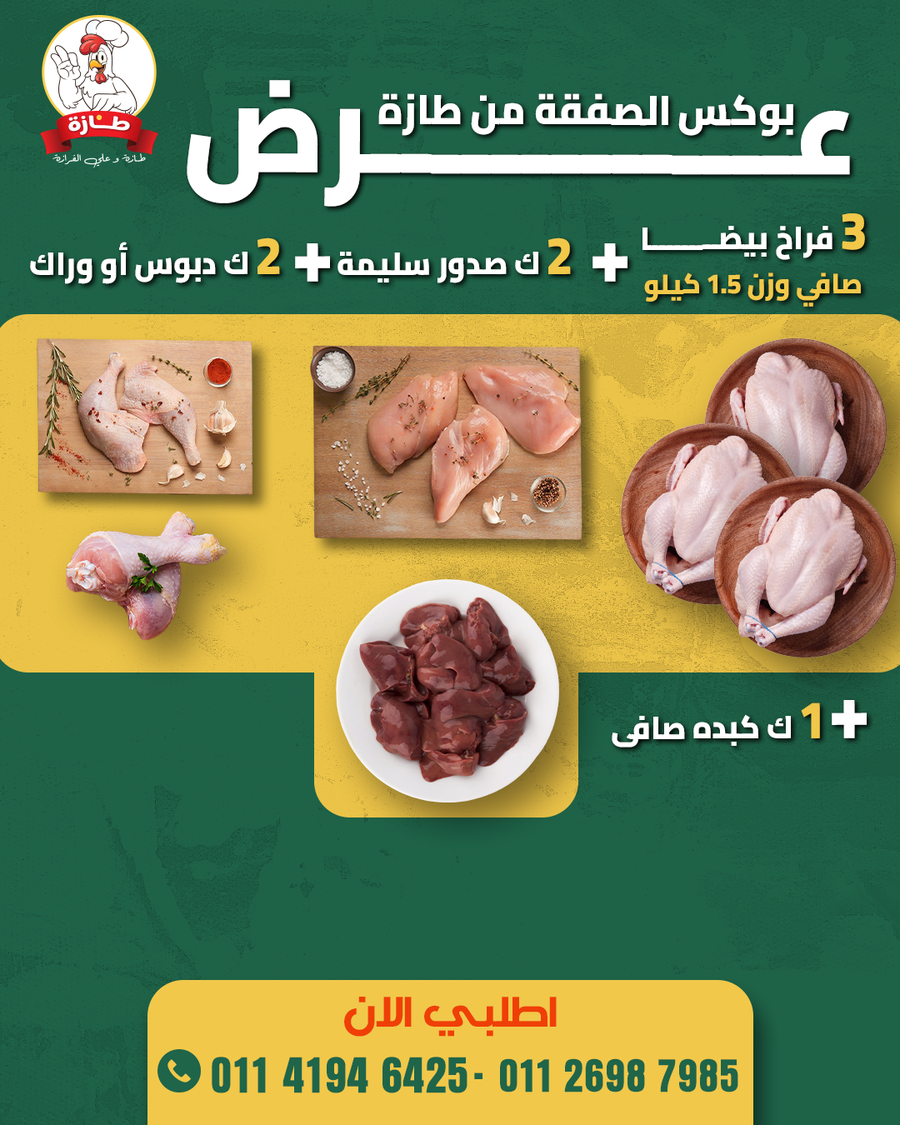 بوكس الصفقة من طازة يشمل عدة منتجات تربية بيتي بدون هرمونات وسن صغير بتستوي بسرعة ولحم طري فريش مغسولة بدقيق وملح وليمون خالية من الريش والزفارة
