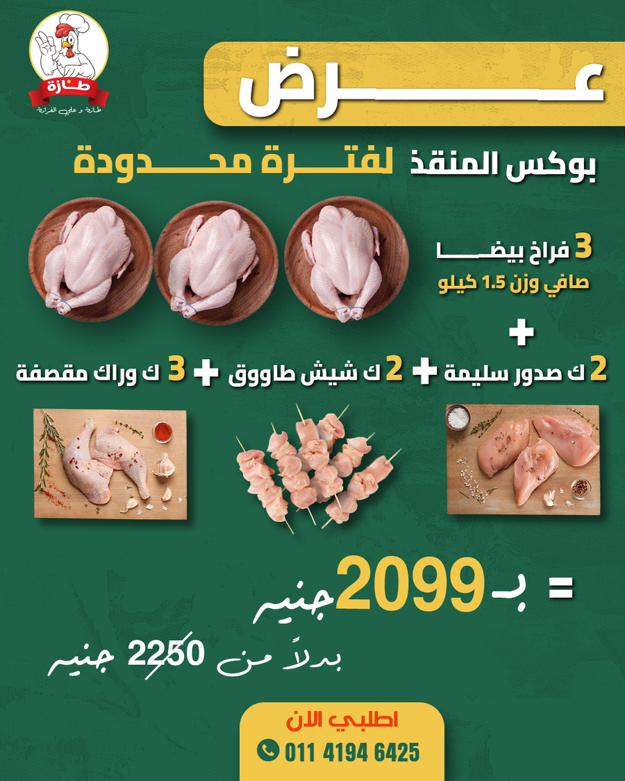 بوكس المنقذ من طازة يشمل عدة منتجات تربية بيتي بدون هرمونات وسن صغير بتستوي بسرعة ولحم طري فريش مغسولة بدقيق وملح وليمون خالية من الريش والزفارة