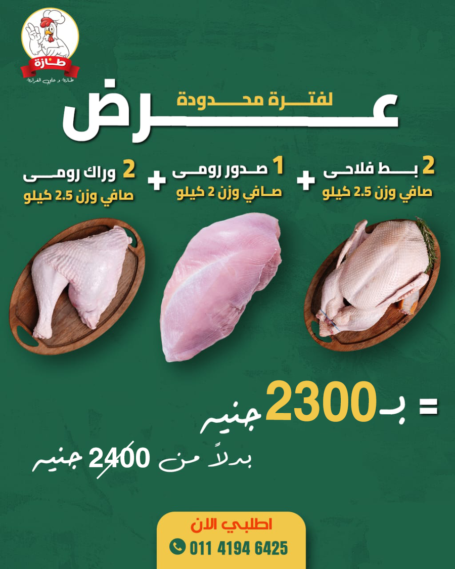بوكس العزومة من طازة يشمل عدة منتجات تربية بيتي بدون هرمونات وسن صغير بتستوي بسرعة ولحم طري فريش مغسولة بدقيق وملح وليمون خالية من الريش والزفارة