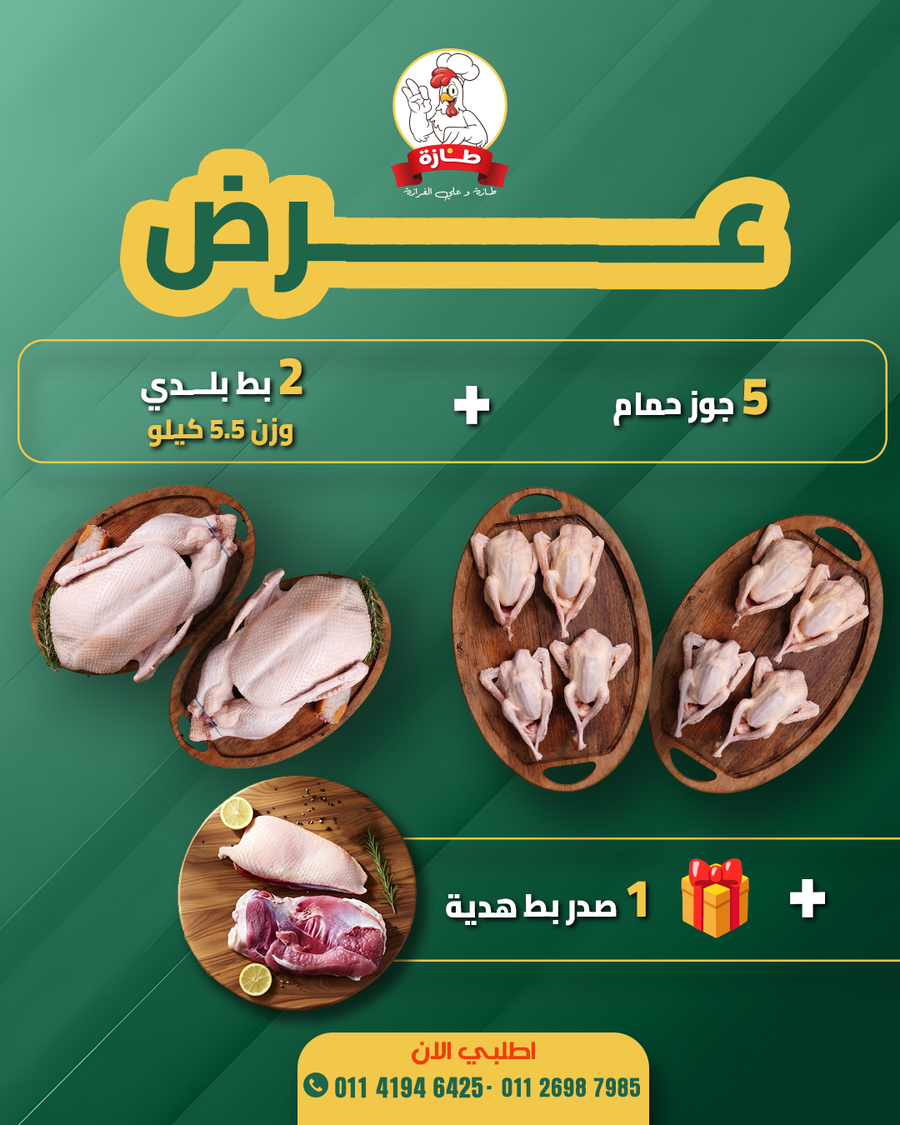 بوكس الطعم الأصيل من طازة يشمل عدة منتجات تربية بيتي بدون هرمونات وسن صغير بتستوي بسرعة ولحم طري فريش مغسولة بدقيق وملح وليمون خالية من الريش والزفارة