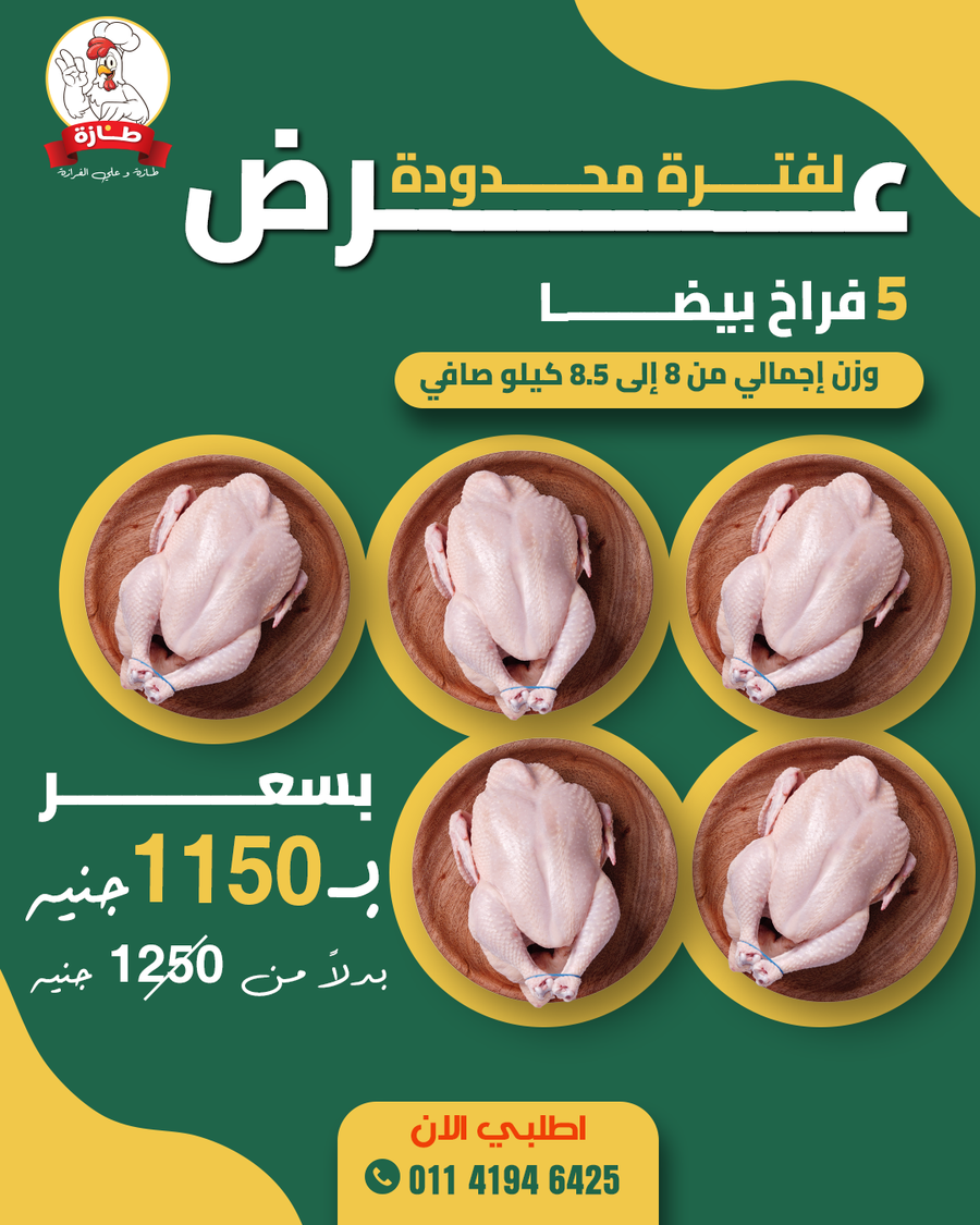 فراخ بيضا تربية بيتي بدون هرمونات وسن صغير بتستوي بسرعة ولحم طري فريش مغسولة بدقيق وملح وليمون خالية من الريش والزفارة